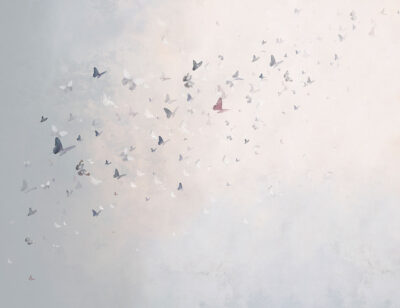 Wall mural dreamlike scene of butterflies in a cloudy ethereal sky
