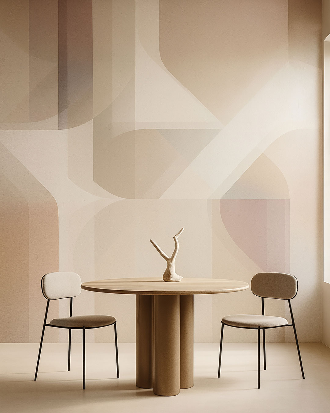 Serein creates a serene atmosphere through delicate translucent layers and soft rounded shapes that gently overlap. Its palette of warm beige, cream and muted blush recalls the look of softly diffused light. This subtle composition visually opens up a room and fills it with a sense of lightness. The mural is ideal for contemporary minimalist interiors where calm and balance are essential. Serein pairs beautifully with light wood, linen textures and natural lighting. Combined with soft textiles, it brings a sense of harmony and understated elegance. It is a versatile choice for bedrooms, living areas or workspaces where softness and spaciousness are desired.