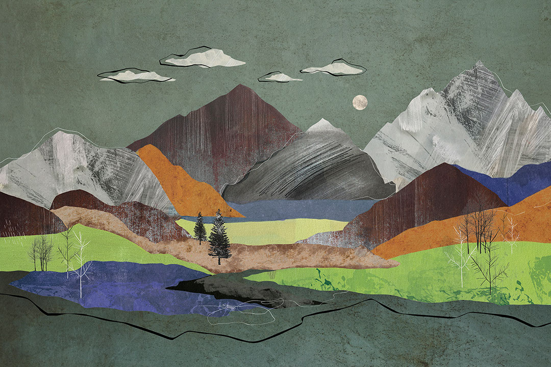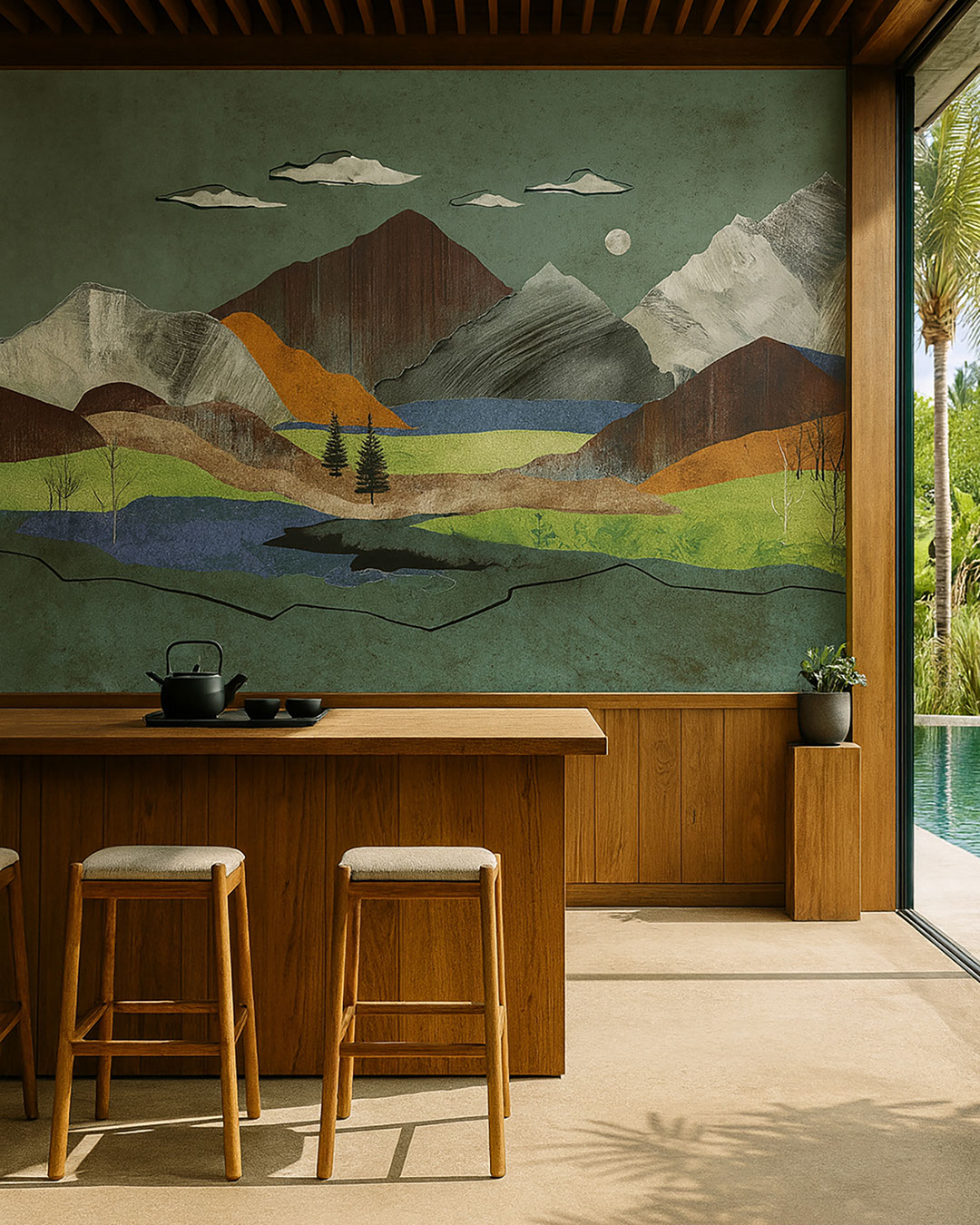 Montara depicts a painterly mountain scene through layered textures and collage-like color fields. The mural adds depth and movement, making the interior feel lively and expressive. Rich greens, blues and terracotta tones create a harmonious natural balance. Montara suits modern and eclectic spaces that benefit from a bold centerpiece. It pairs beautifully with natural materials such as wood and stone. In larger rooms it enhances the feeling of openness and scenic perspective. It is an excellent choice for living rooms, home offices and creative environments.