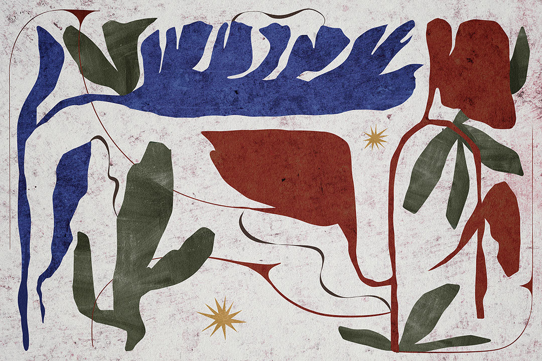 Wall mural with bold botanical silhouettes in blue, terracotta and olive tones