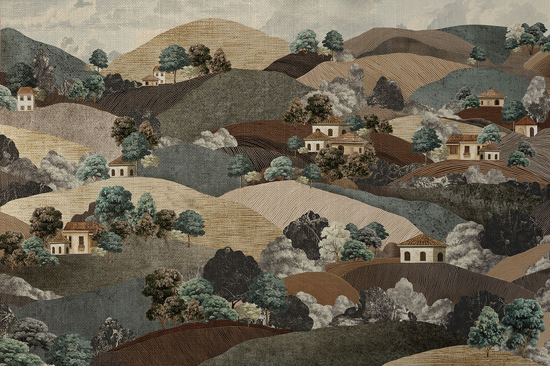 The Toscara wall mural transports you to a gentle Italian landscape of rolling hills, vineyards and small farmhouses nestled among trees. Fine hatching lines evoke woven textiles, giving the scenery a tactile, layered feel. Warm tones of ochre, terracotta, soft green and stone grey create the mood of a cosy countryside and unhurried living. These wallcoverings are perfect for dining rooms, open-plan kitchens or living areas where you want to invite a sense of hospitality and long evenings at the table. In restaurants, wine bars or cafés, Toscara reinforces the brand story and visually wraps guests in the landscape. The print pairs beautifully with natural wood, ceramics, linen and wrought metal. It is a choice for those who love Mediterranean moods and dream of a home among the hills.