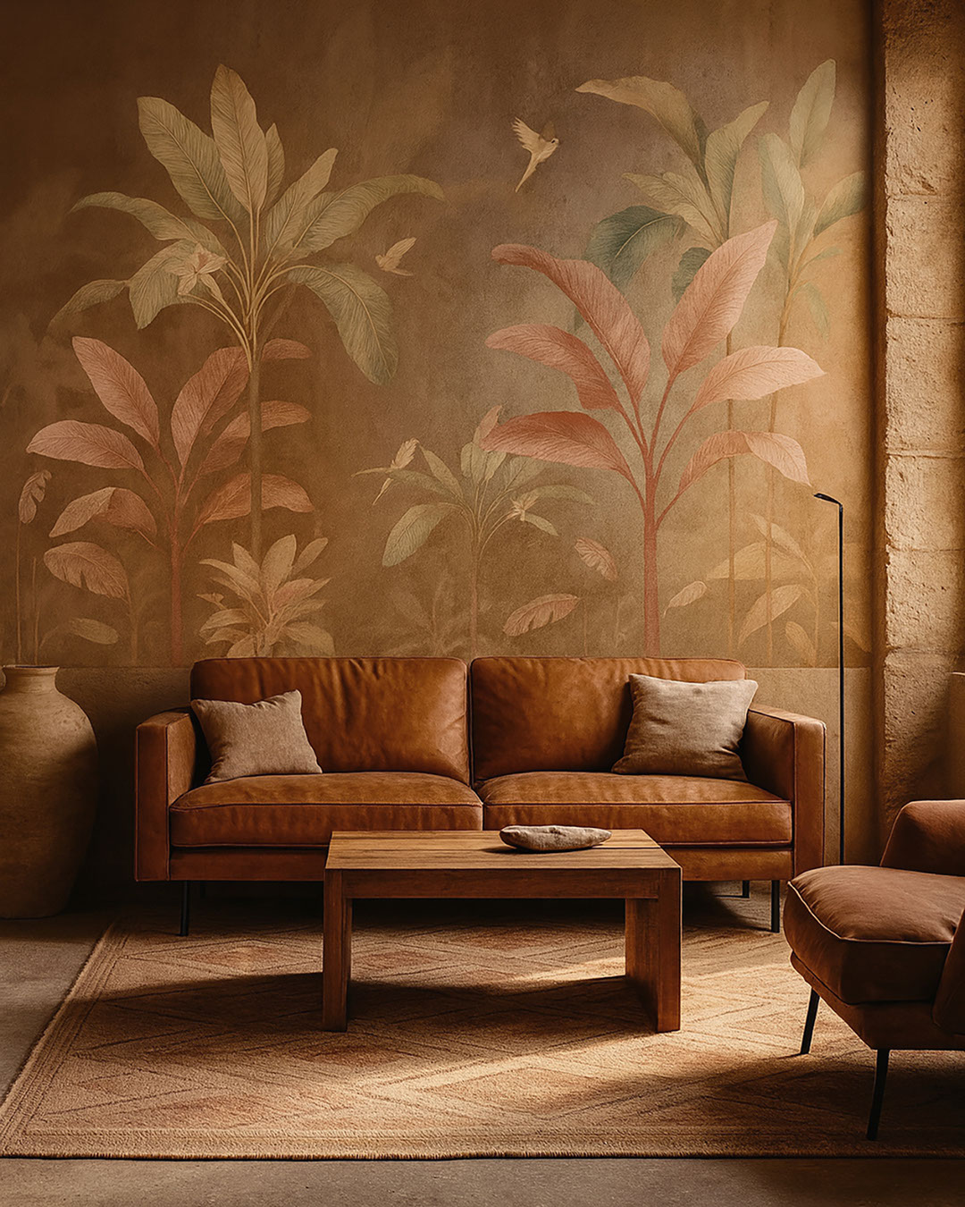 This wall mural creates an atmosphere of serene exoticism, combining refined tropical foliage with delicate birds. The warm brown background adds depth and a natural textured effect. The overall composition radiates coziness and evokes the feeling of soft sunlight. It suits interiors in natural, eco, and colonial styles. The mural brings harmony, warmth, and subtle elegance to any room. Its gentle tones make the space feel visually soft and balanced. A versatile choice for bedrooms, living rooms, or relaxation areas.